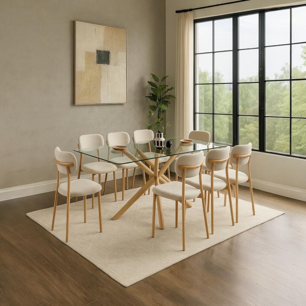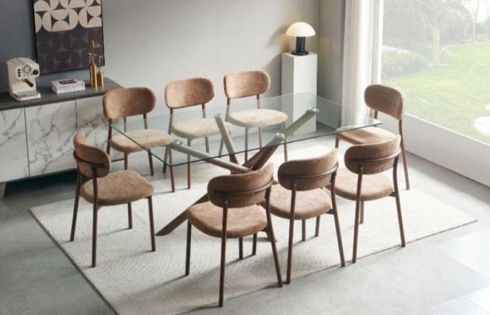 طقم سفرة 8 مقاعد بتصميم مودرن يجمع بين الأناقة والعملية، طاولة كبيرة بسطح زجاجي متين مع 8 كراسي مريحة تناسب جميع الجلسات العائلية وتضفي لمسة راقية على ديكور منزلك.