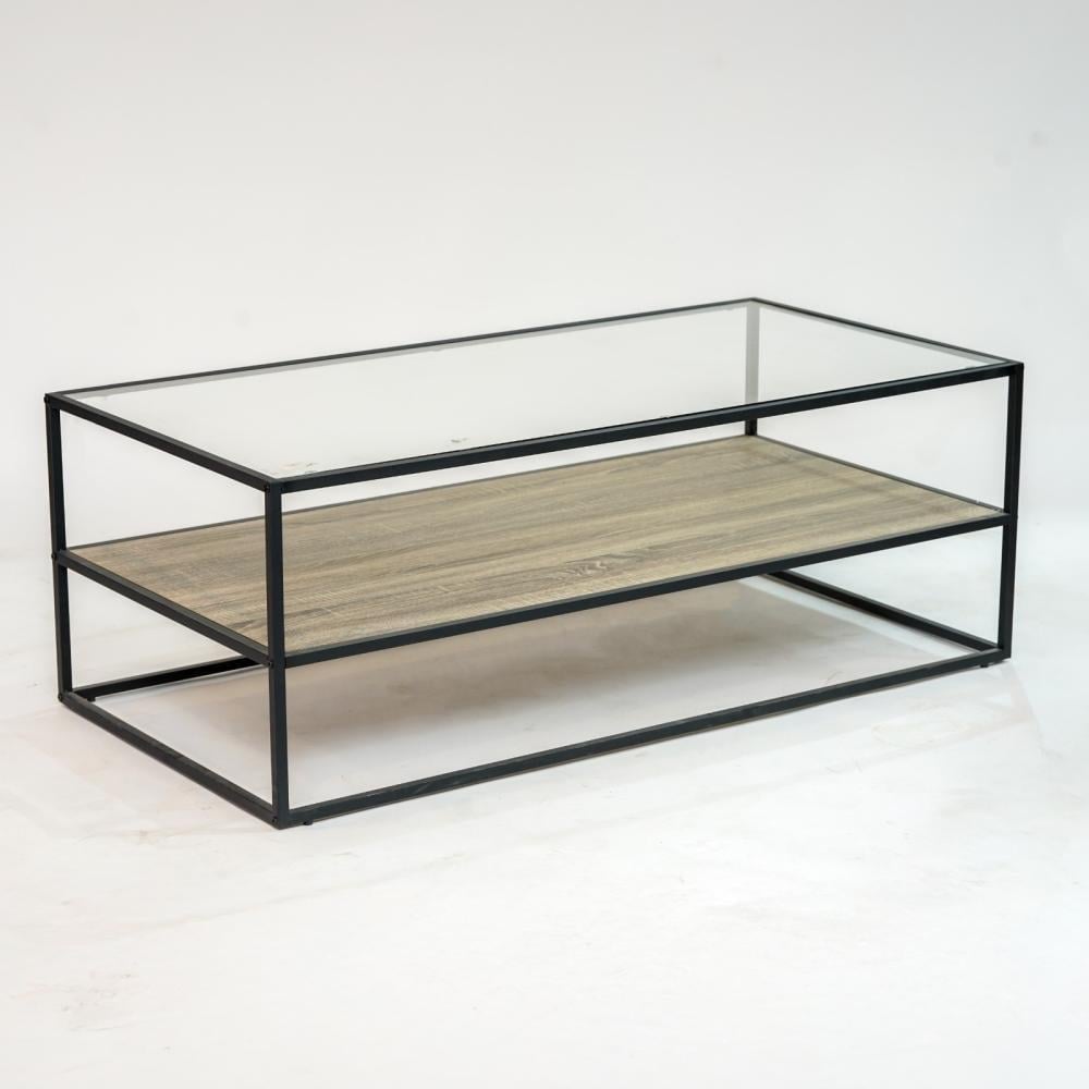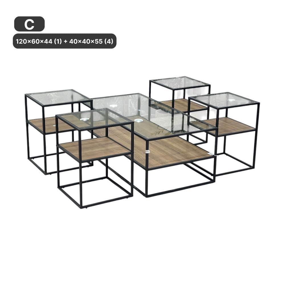 طقم طاولات مودرن بتصميم عصري يجمع بين الزجاج الشفاف والقواعد المعدنية السوداء ليمنحك مظهراً أنيقاً ومتناسقاً. مزوّد برف خشبي عملي، يمكن استخدامه كطاولات قهوة أو طاولات جانبية تناسب مختلف المساحات والديكورات.