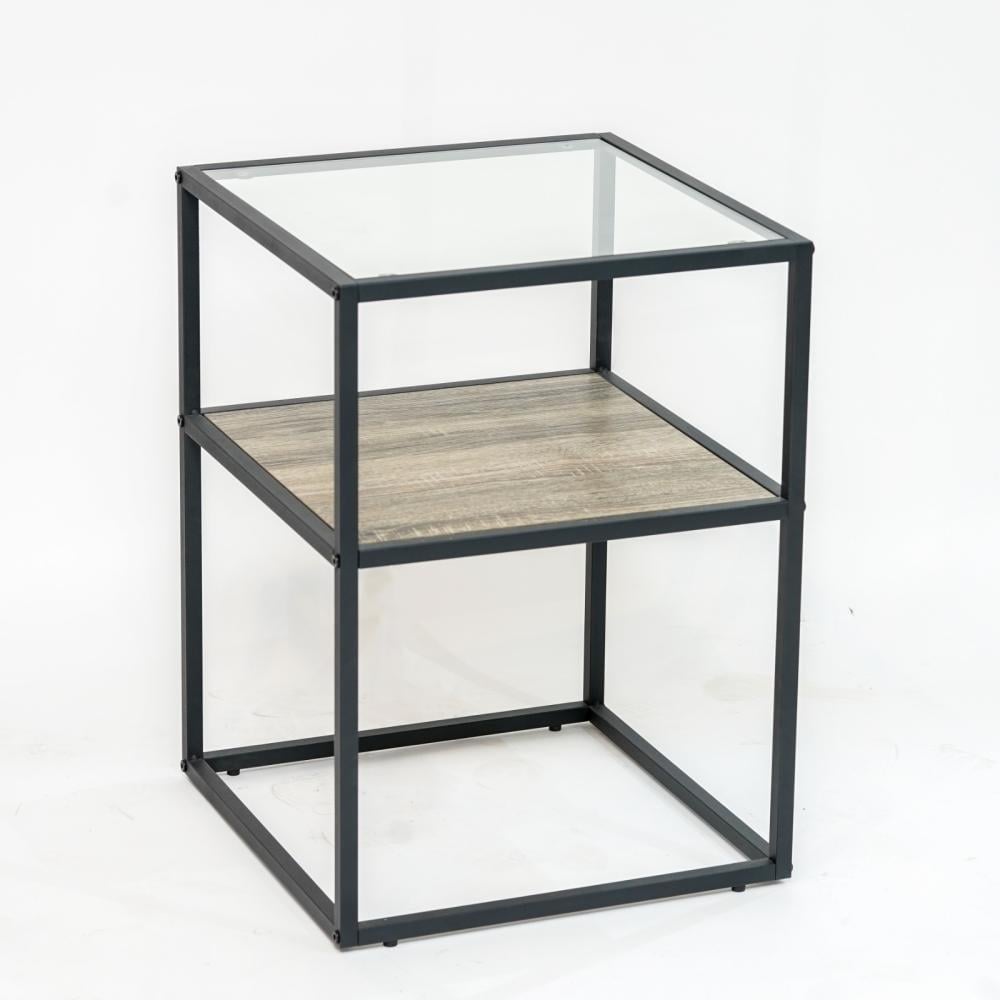 - المواد: سطح زجاجي مقوى + قواعد معدنية + رف خشبي سفلي
